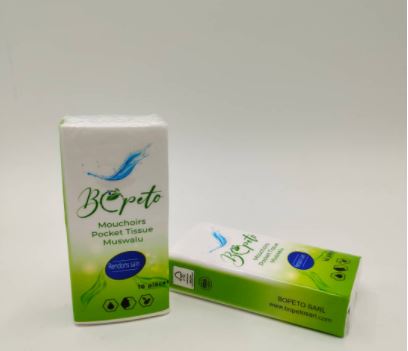 La République Démocratique du Congo qui est une nation pétrie des talents et des compétences humaines a vu naitre en 2020, une entreprise spécialisée dans la production et la commercialisation des papiers sanitaires(mouchoirs à papiers, essuie tout, serviettes de table, papiers hygièniques, mouchoirs pour véhicule, lingettes et autres…) : BOPETO Sarl