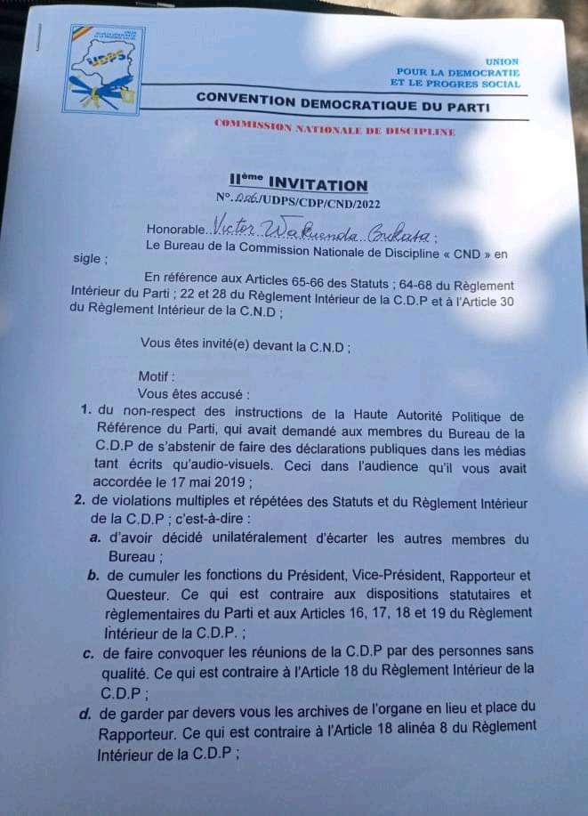 Voici l’intégralité de la lettre de la commission de discipline de l’UDPS adressée à. Victor WAKUENDA.